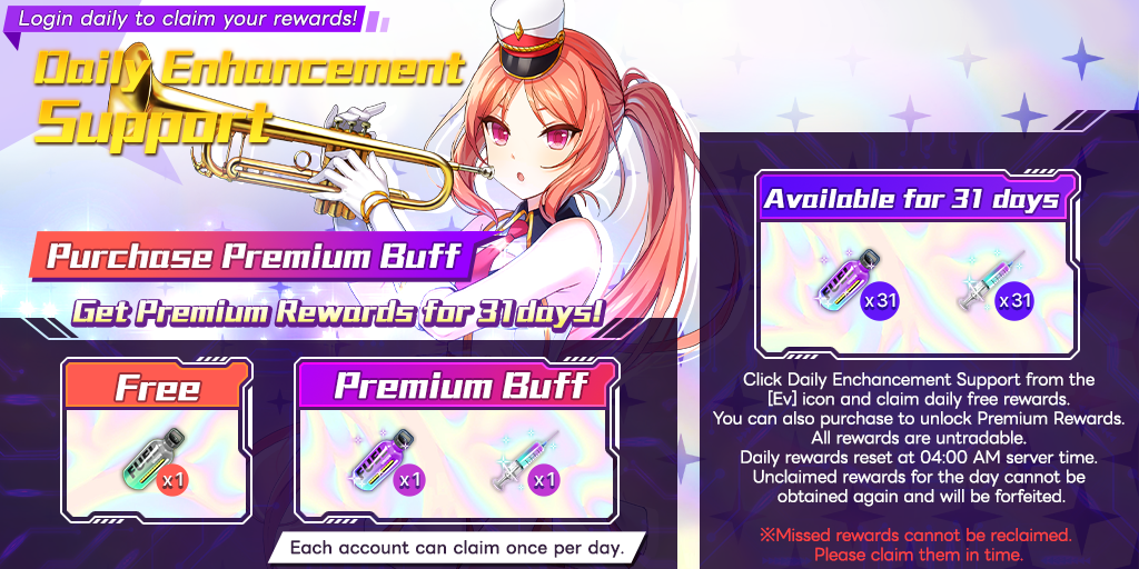 Daily Enhancement Support Premium Buff: Available once per account monthly, lasting 31 days.