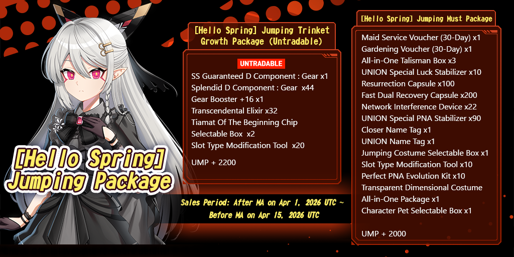 x1 Maid Service Voucher (30-Day) x1 Gardening Voucher (30-Day) x3 All-in-One Talisman Box x10 UNION Special Luck Stabilizer x100 Resurrection Capsule x200 Fast Dual Recovery Capsule x22 Network Interference Device x90 UNION Special PNA Stabilizer x1 Closer Name Tag x1 UNION Name Tag x1 Jumping Costume Selectable Box x10 Slot Type Modification Tool x1 Perfect PNA Evolution Kit x1 Transparent Dimensional Costume All-in-One Package x1 Character Pet Adult Container Selectable Box UMP 2,000
