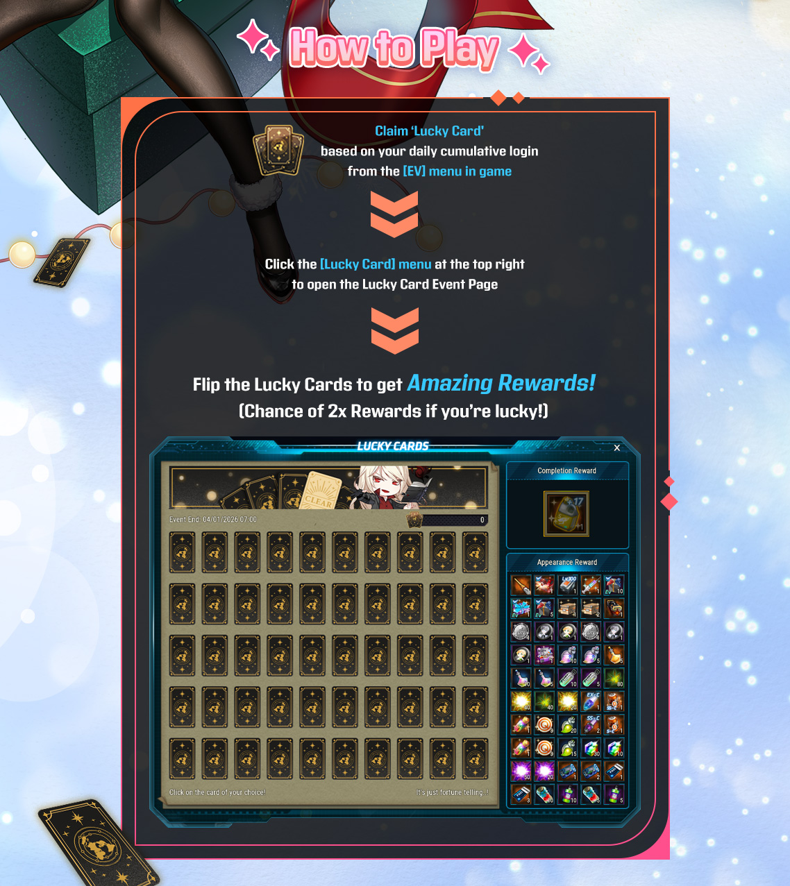 Collect Lucky Cards from Daily Accumulative Login and flip them in the Lucky Card UI to claim rewards.