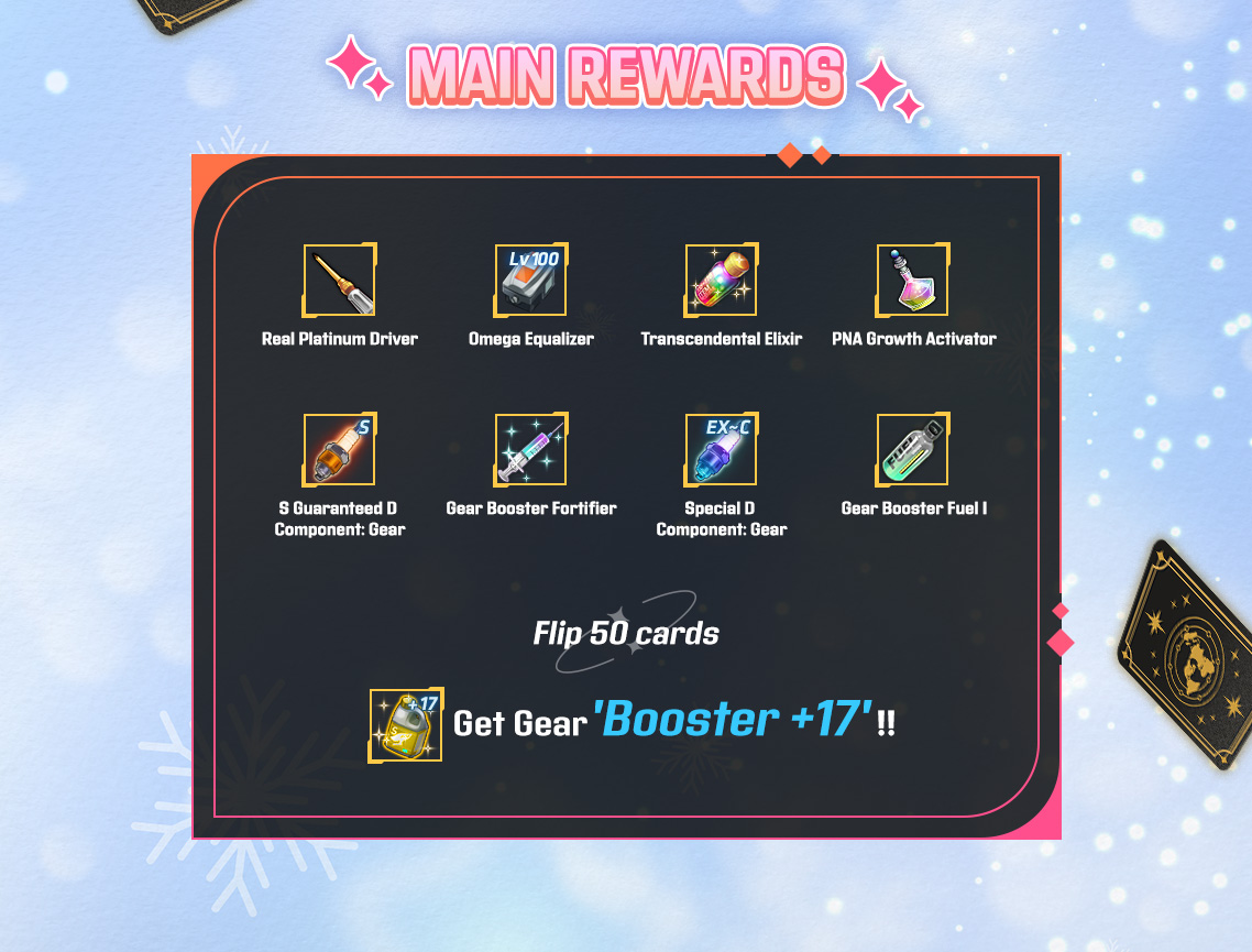 Other rewards from the Lucky Card Event include Real Platinum Driver, 3★ Boss Phase Wings Selectable Box ver1.2, Omega Equalizer, Gear Booster Fortifier, and more valuable rewards! |