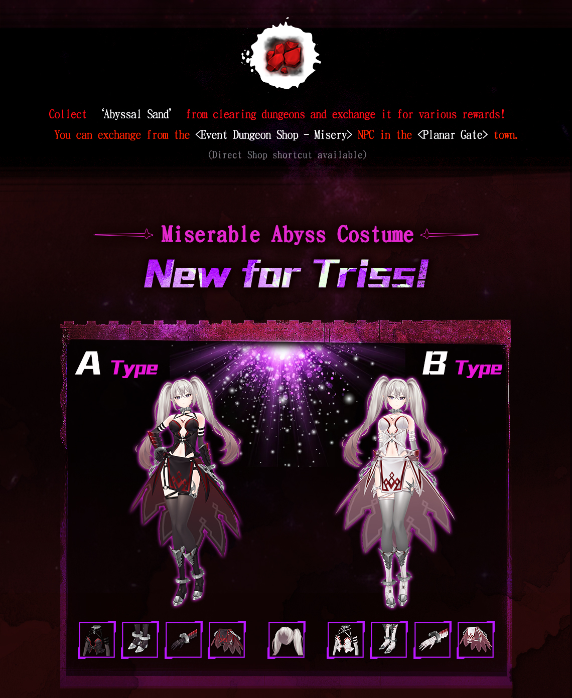 Gather ‘Abyssal Sand’ from the Event Dungeon 'Nightmarish Throne', and purchase reward items at the NPC shop.