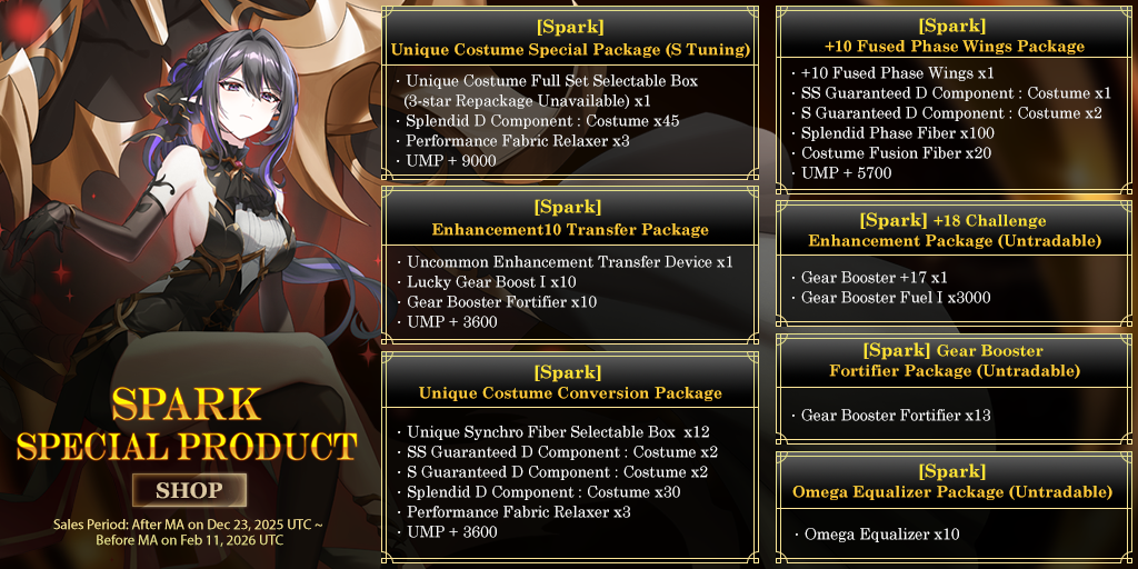 x12 Unique Synchro Fiber Selectable Box x2 SS Guaranteed D Component : Costume x2 S Guaranteed D Component : Costume x30 Splendid D Component : Costume x3 Performance Fabric Relaxer UMP 3,600