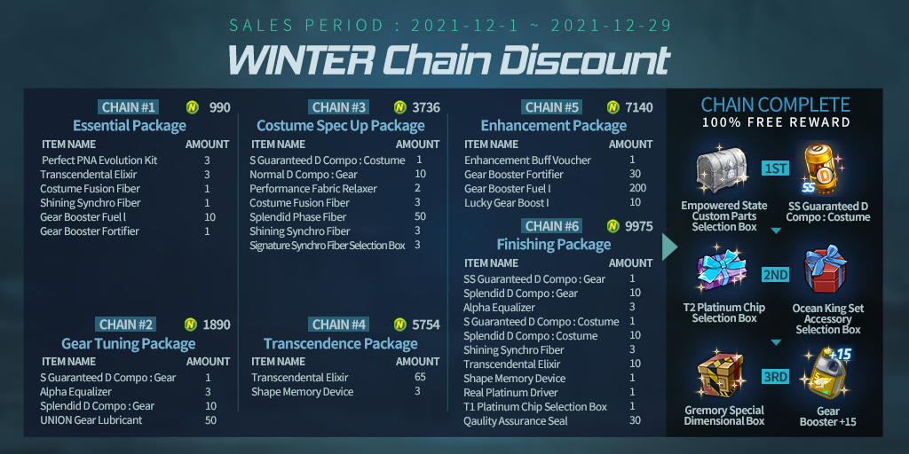 1st Discount 990 N-Coins | Winter Essential Package x3 Perfect PNA Evolution Kit x3 Transcendental Elixir x1 Costume Fusion Fiber x1 Shining Synchro Fiber x10 Gear Booster Fuel I x1 Gear Booster Fortifier |