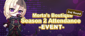 Morta’s Boutique AttendanceSeason 2 - Round 2 Round 2 begins, extending Morta’s Boutique Attendance rewards! Event Period After maintenance on April 15, 2026 - Before maintenance on May 13, 2026 UTC ▶ Log-in Attendance Log in every day to collect Morta’s Boutique Coins. The more you log in, the more